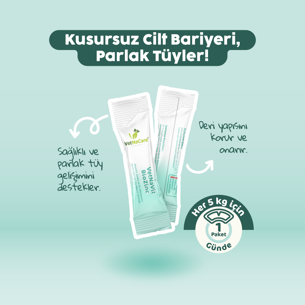 Kedi ve köpeklerde deri ve tüy sağlığı, genel yaşam kalitesinin önemli bir parçasıdır. VetNaVit BioZinc, içerdiği biyotin ve çinko ile deri yapısını desteklerken, DL-metiyonin sayesinde tüylerin güçlenmesine katkı sağlar. Düzenli kullanımda daha sağlıklı bir görünüm elde edilmesine yardımcı olur.