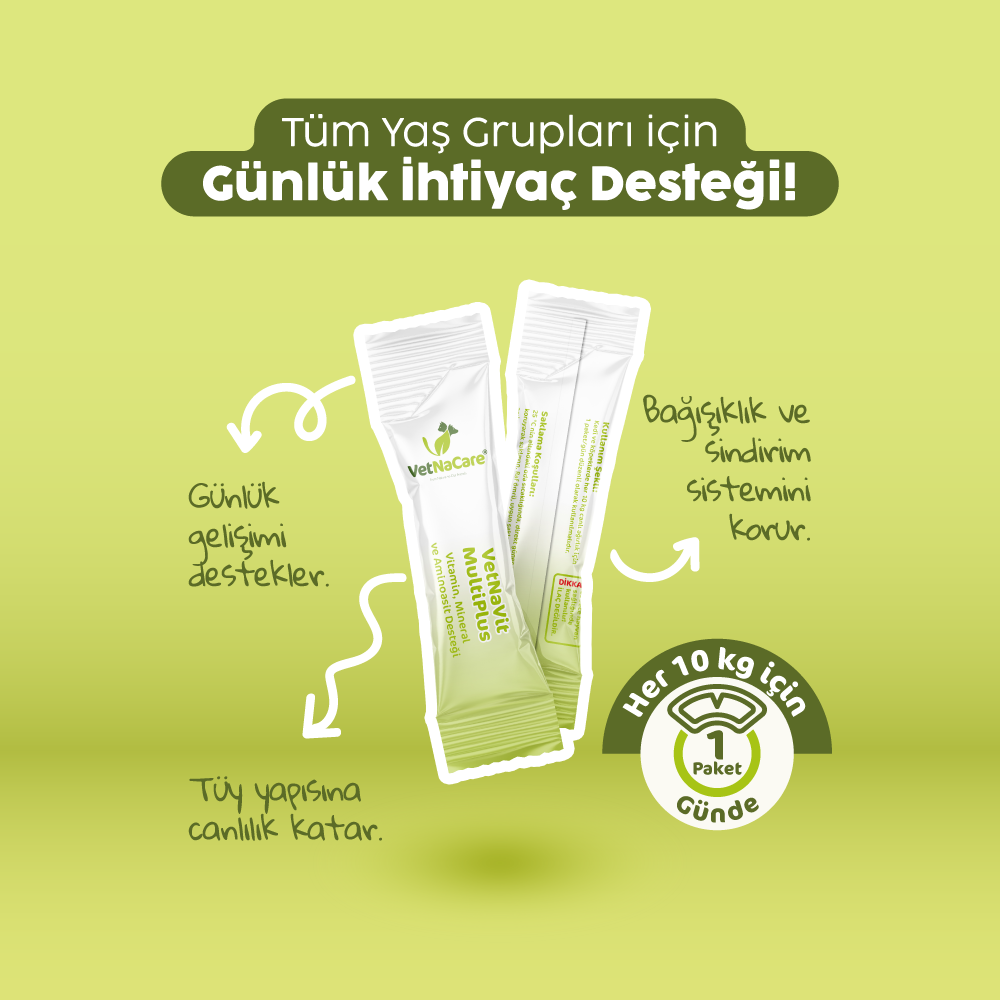 Kedi ve köpeklerin günlük beslenme rutinleri her zaman tüm ihtiyaçları karşılamayabilir. VetNaVit MultiPlus, eksik kalan vitamin ve mineralleri tamamlayarak dengeli bir beslenmeye katkı sağlar. Özellikle büyüme döneminde, yoğun stres altında veya bağışıklığın desteklenmesi gereken durumlarda etkili bir çözüm sunar.