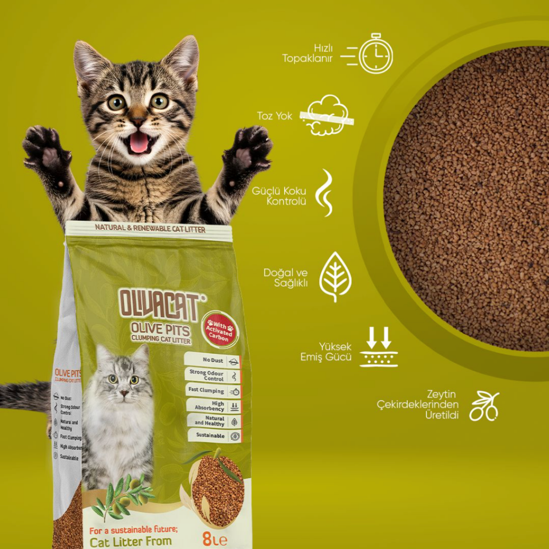 Olivacat zeytin çekirdeğinden üretilen tozsuz, doğal ve çevre dostu bir kedi kumudur. İçerisindeki aktif karbonlar sayesinde kötü kokuyu maksimum seviyede hapsederek kediniz ve sizin için konfor sağlar. Yüksek emicilik kapasitesi sayesinde hızlı topaklanarak kolayca temizlenebilir. Olivacat aktif karbonlu tozsuz kedi kumu, kedinizin ve sizin sağlığını korumak amacıyla %100 doğal zeytin çekirdeğinden üretilmiş hiçbir zararlı kimyasal içermeyen tamamen doğal bir üründür.